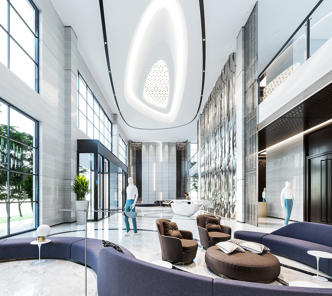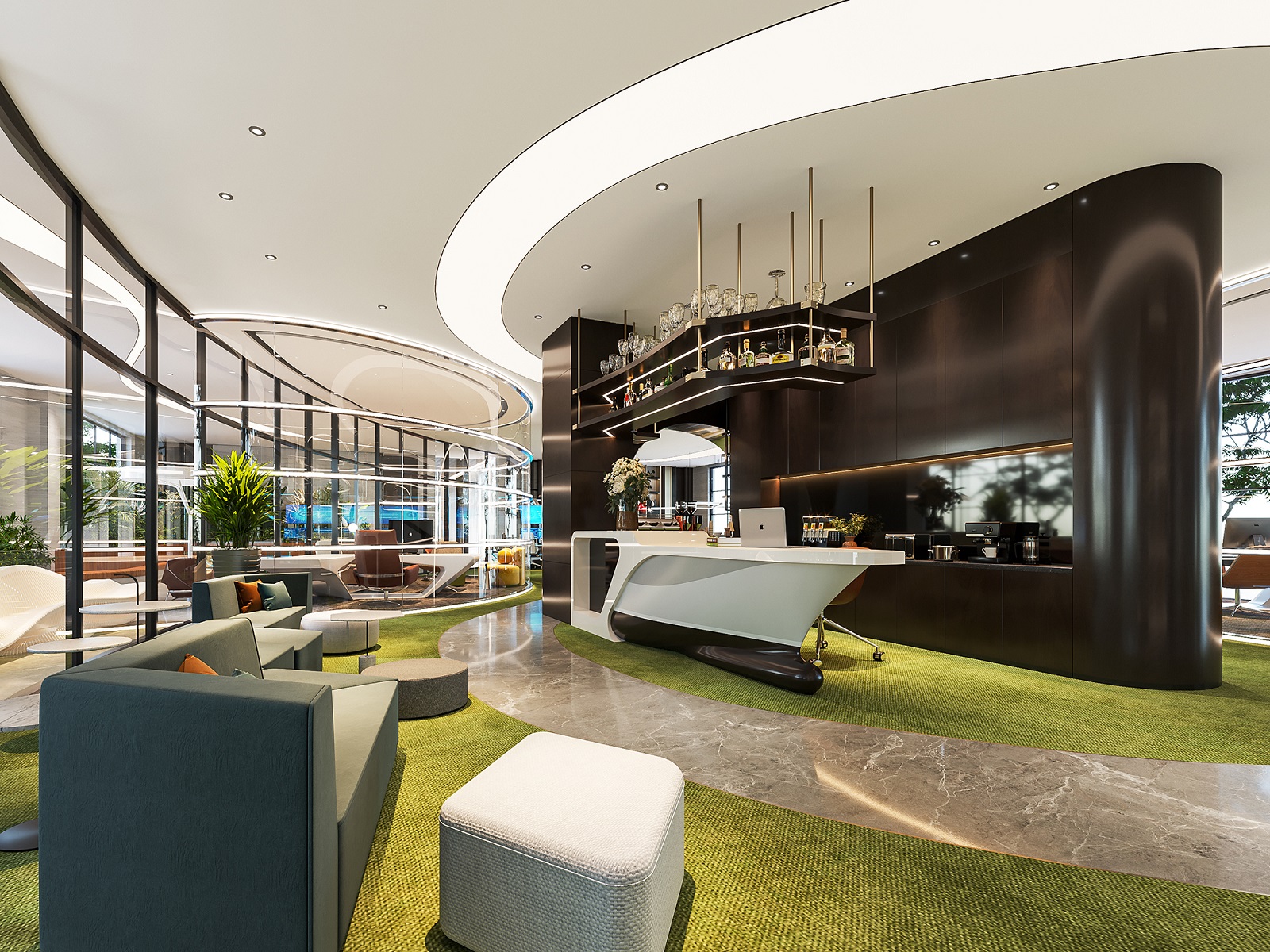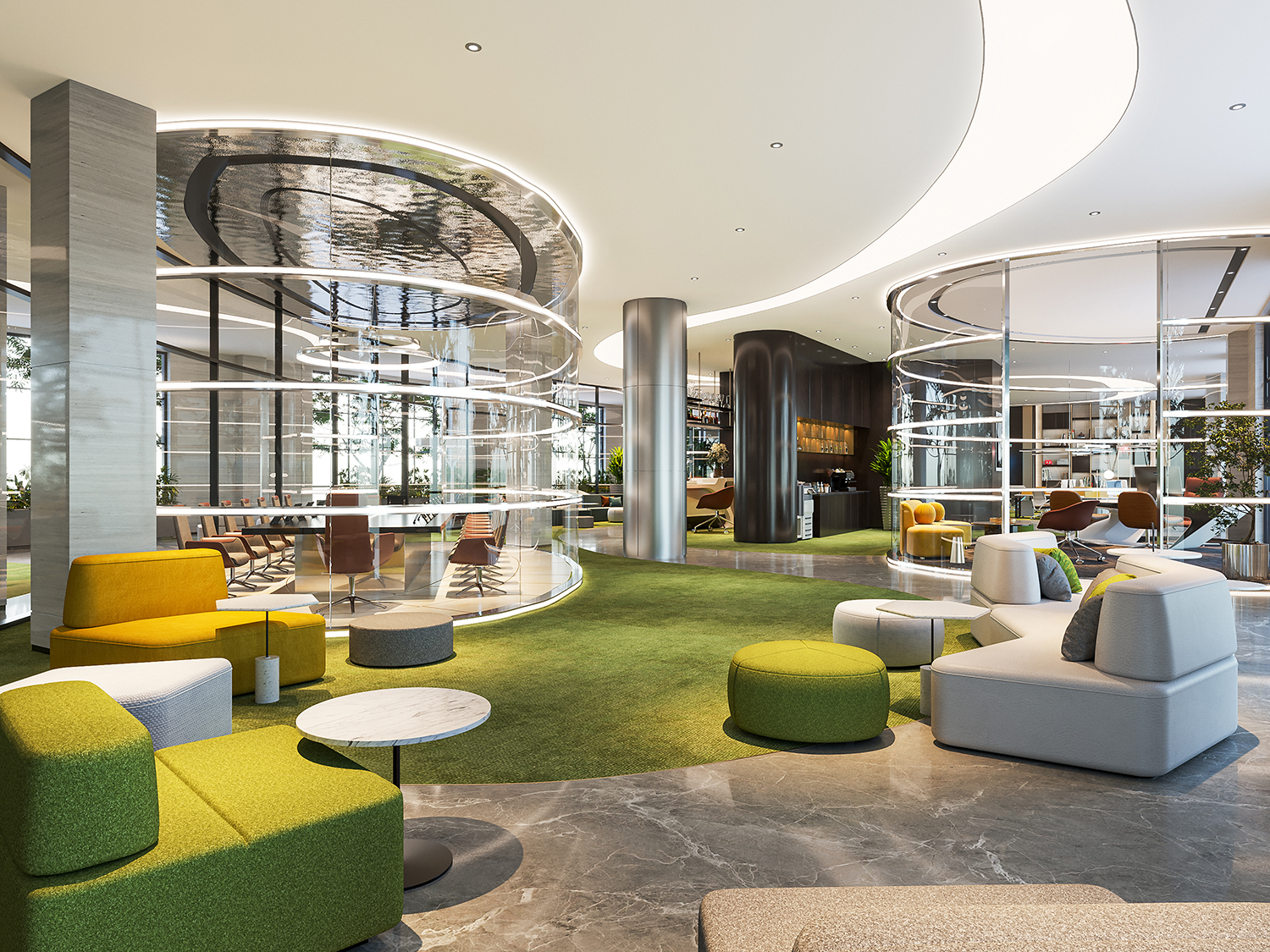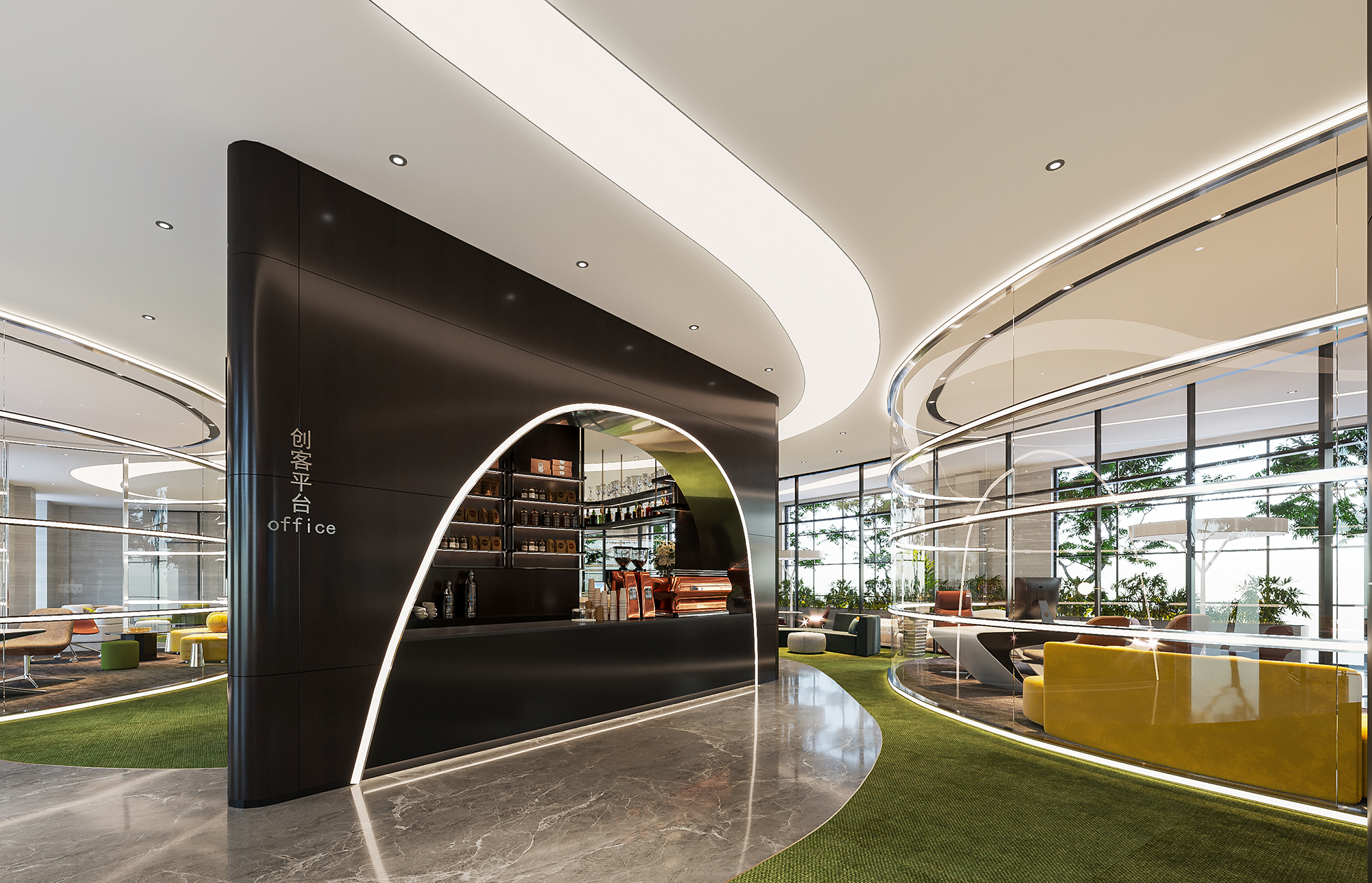 案例說明:本案設計首先闖入眼簾的是企業形象墻,以其企業文化的新興、蓬勃、嚴謹為主題,兩側以“居有竹、步步高”的銀色墻柱帶來視覺沖擊感,加上企業形象色的類比色、淺色石材及不銹鋼條的運用,顯示出金屬的質感和工業文明的主題;華堂上方呼應以直線為主調、大筆勾勒而出的時尚型弧面吊頂,大直大方顯示出強烈的縱深感,加之以清透、明媚的光色渲染,工整氣派、大家風范,反襯出貴公司辦公樓的現代時尚特性,以干練快捷的設計節奏,展示出質量與效率并舉的時代精神。