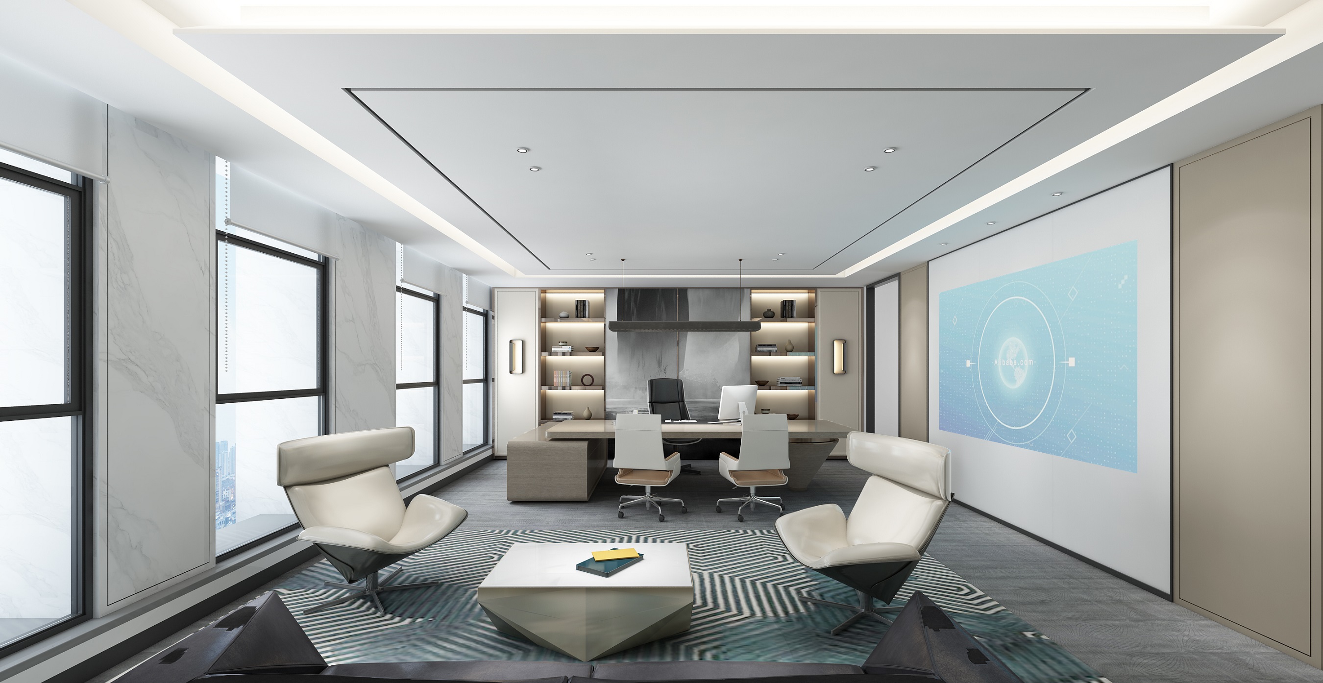 案例說明:本案在設計中因為空間較寬敞,加之衛生間門的開向正對室內,特設計了展示性隔斷柜,加強其辦公、會客及生活的區域性,既做到了空間上的劃分,又可通過展示柜內的擺設輔助室內布置呈現事業風貌及個人雅興,體現其穩重而時尚的人性化的特點。