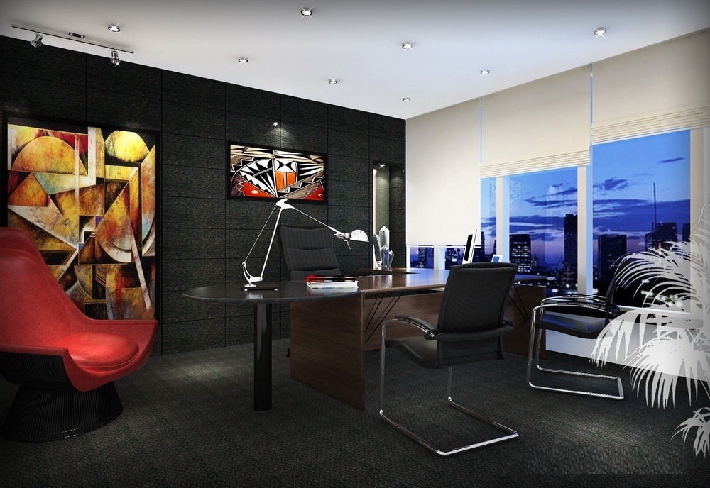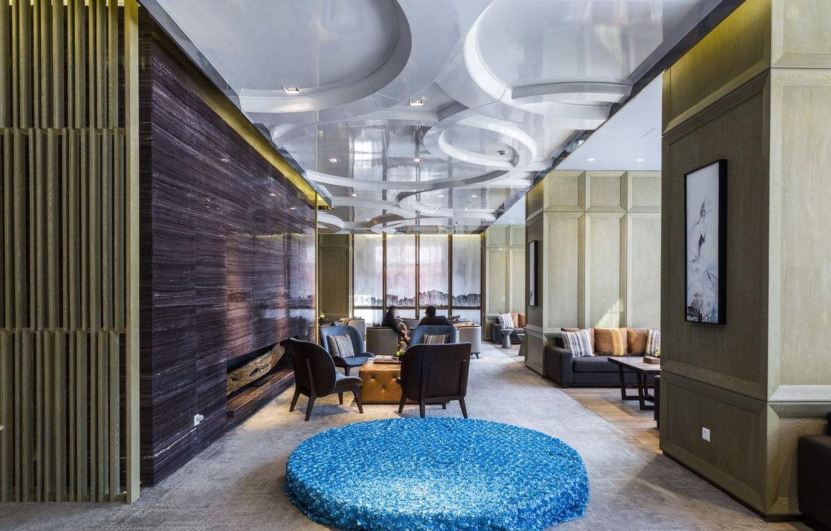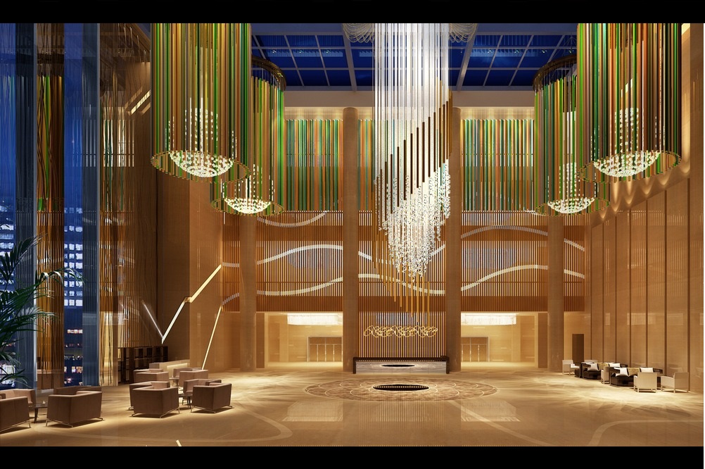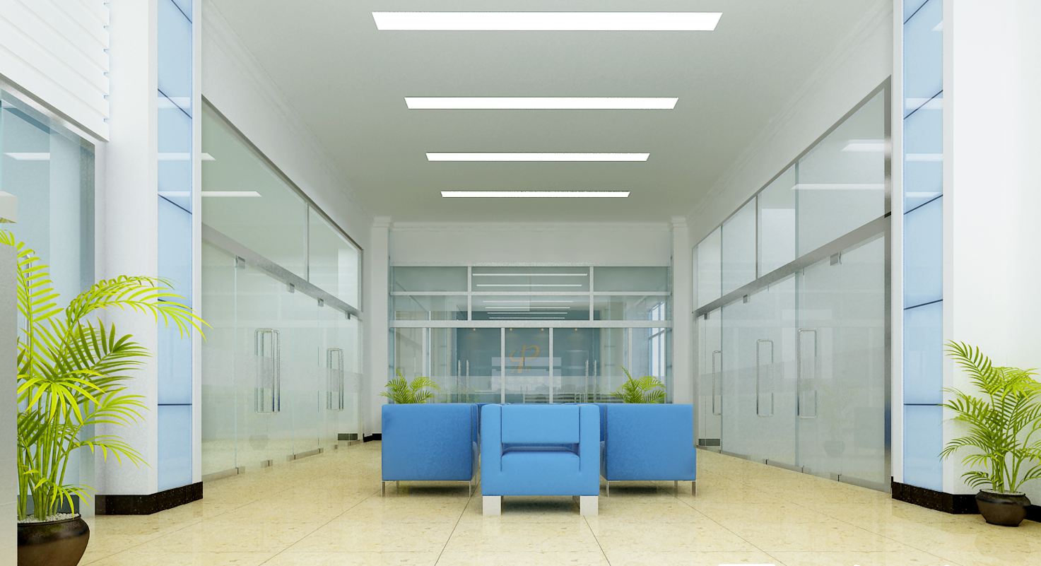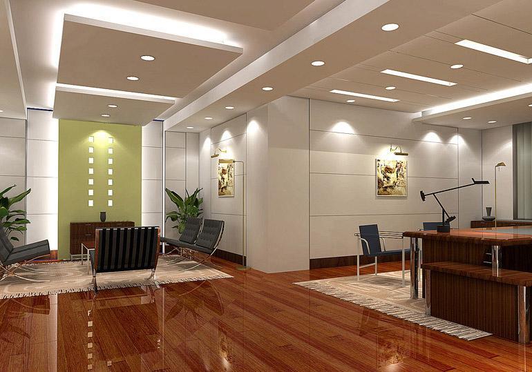 案例說明:本案設計首先闖入眼簾的是企業形象墻,以其企業文化的新興、蓬勃、嚴謹為主題,兩側以“居有竹、步步高”的銀色墻柱帶來視覺沖擊感,加上企業形象色的類比色、淺色石材及不銹鋼條的運用,顯示出金屬的質感和工業文明的主題;華堂上方呼應以直線為主調、大筆勾勒而出的時尚型弧面吊頂,大直大方顯示出強烈的縱深感,加之以清透、明媚的光色渲染,工整氣派、大家風范,反襯出貴公司辦公樓的現代時尚特性,以干練快捷的設計節奏,展示出質量與效率并舉的時代精神。