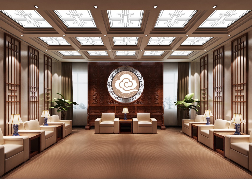 案例說明:本案在設(shè)計(jì)中采用環(huán)環(huán)相扣的圓弧頂面造型,層層遞近的燈具圍繞圓型屋頂向外拓展,突出空間的立體造型感,也使天花燈飾顯出碧玉般通透潤澤的光影。設(shè)計(jì)成舞臺(tái)平臺(tái)的主席臺(tái)具備多功能的特點(diǎn),可兼顧各類舞臺(tái)表演及大型會(huì)場會(huì)議的組織。粗曠沉穩(wěn)的圓形大立柱及方柱,頗具雄偉之勢(shì),但是考慮到其在大型場地內(nèi)的阻礙性問題,故不將此做再多修飾,僅僅以真石漆的噴涂來達(dá)到既不擴(kuò)大柱圍又美化柱體的作用;地面以座位的安排為向?qū)Вo以簡易直紋拼花來點(diǎn)綴。